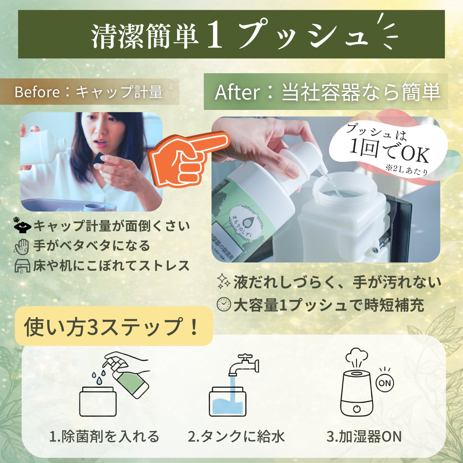 押すだけで適量が量れる便利な容器を採用しております。