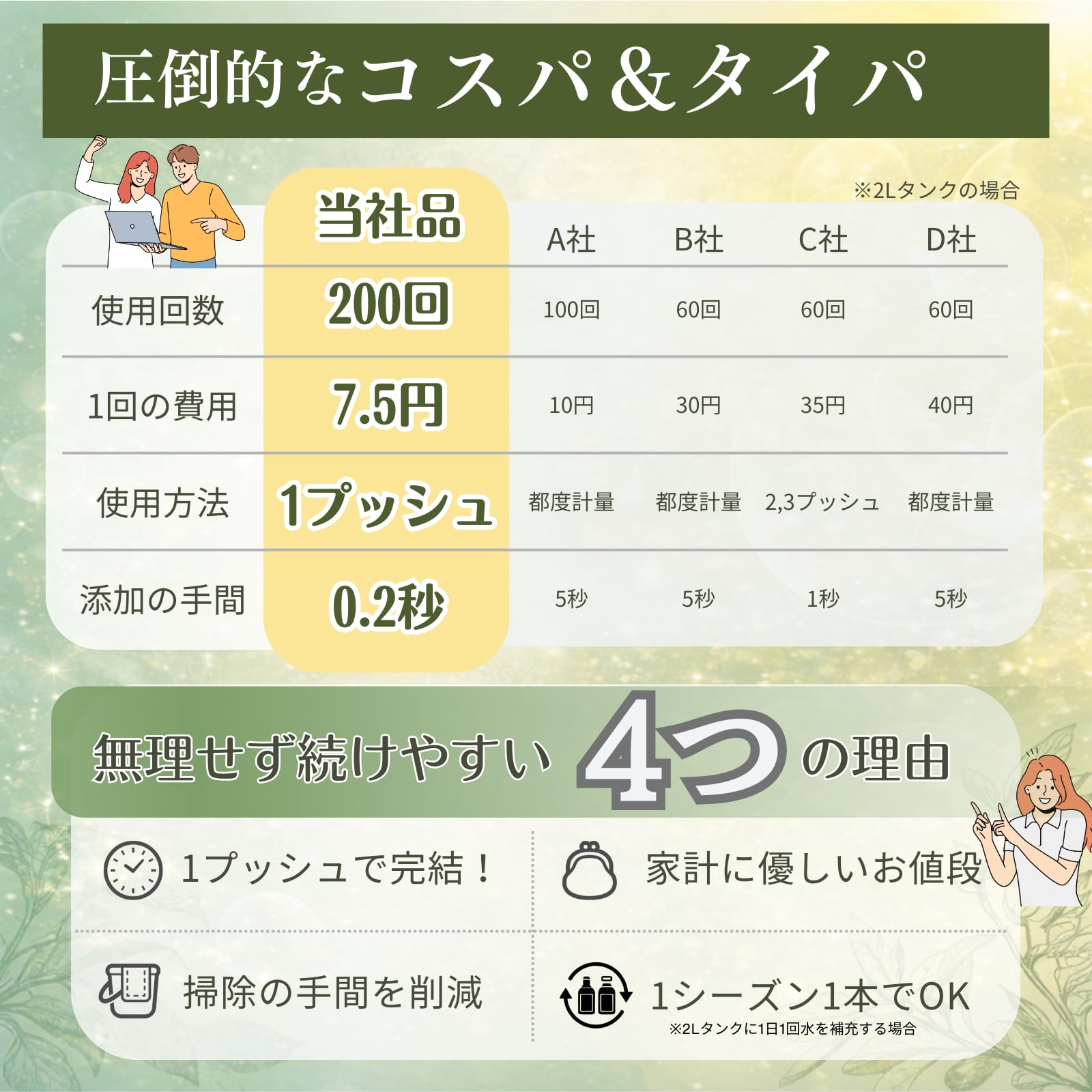1日15円×100日分の大容量です。※4Lタンクに1日10ml使用時(1ml1.5円)
