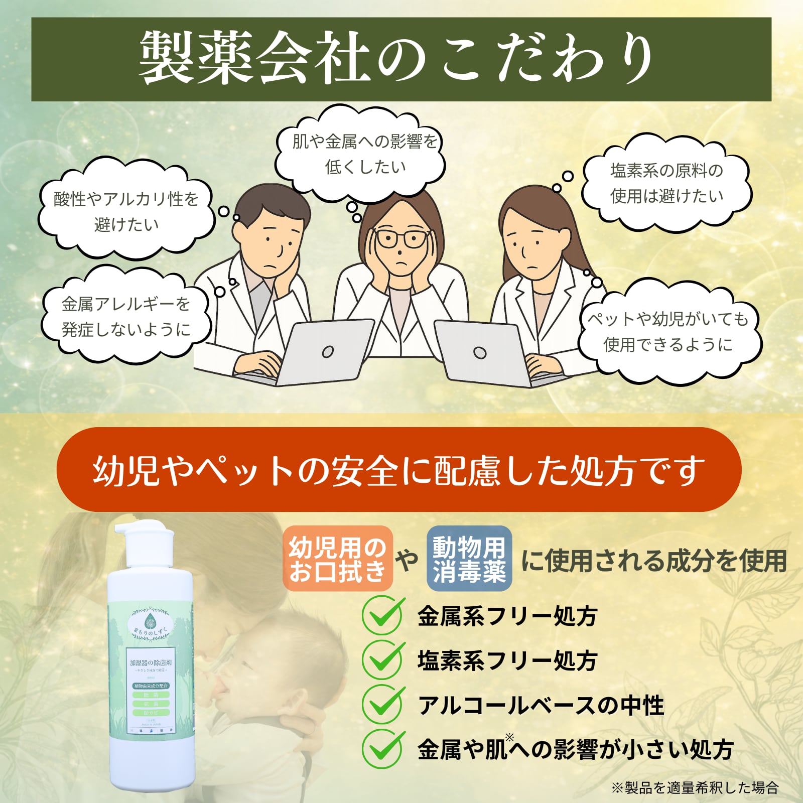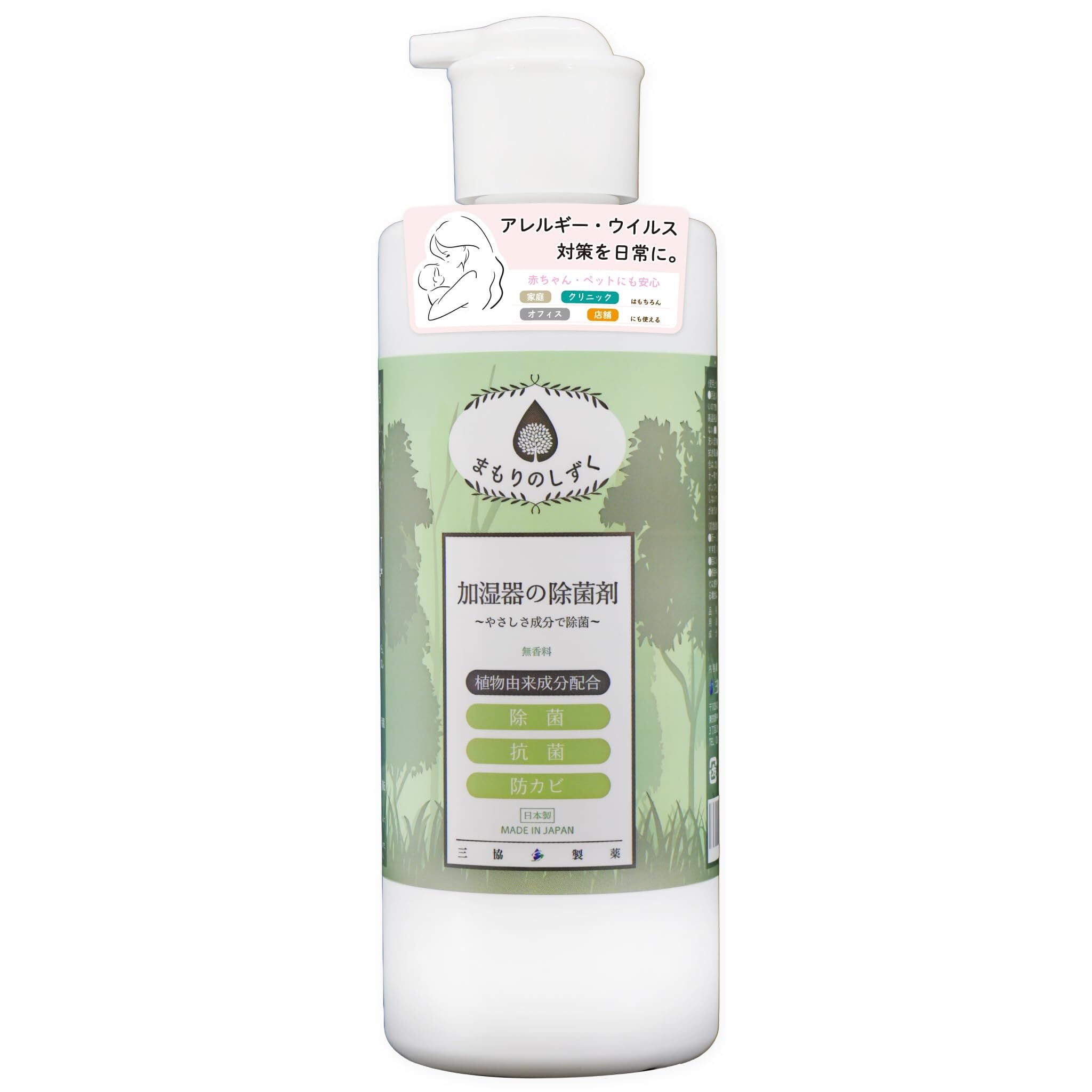 植物由来成分を使用した除菌剤。空間に薬剤を撒き散らさず、赤ちゃん・ペットがいるご家庭でも使いやすいです。